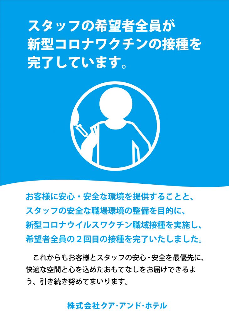 この度弊社は、安心・安全な環境を提供することと、スタッフの安全な職場環境の整備を目的に、新型コロナウイルスワクチン職域接種を実施し、希望者全員の2回目の接種を完了いたしました。