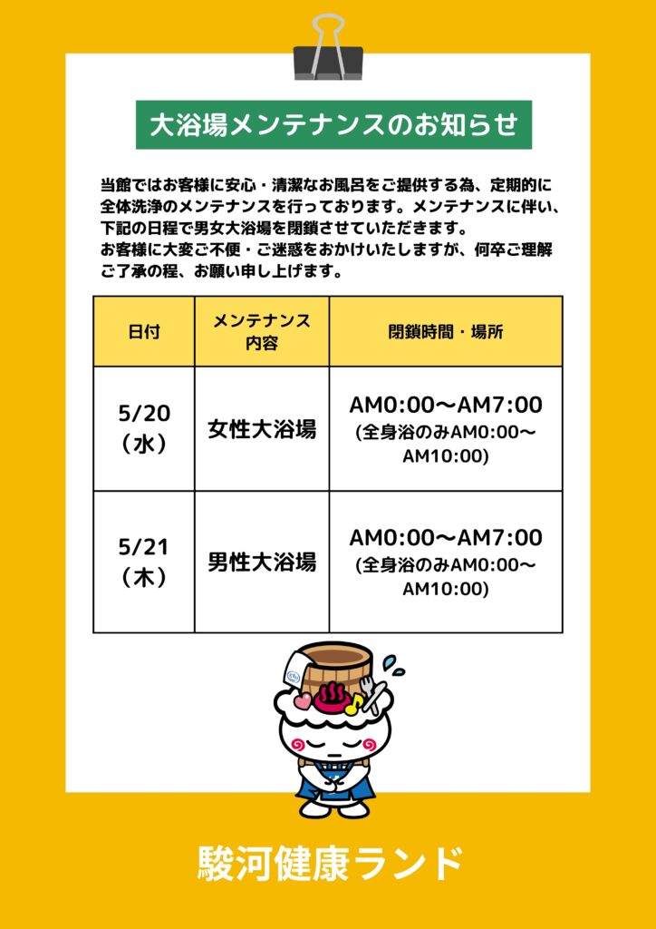 【大浴場メンテナンスのお知らせ】