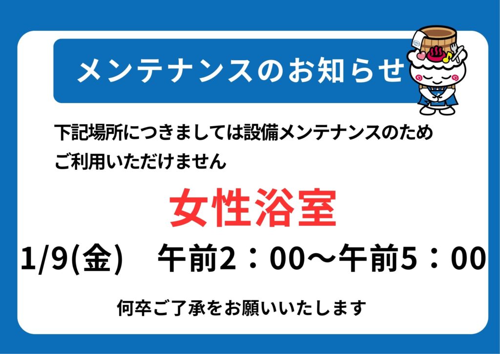 女性浴室 メンテナンスのお知らせ 2026.01.05 メンテナンス情報 平素より当館をご利用いただき誠にありがとうございます。 上記日程にて女性浴室がメンテナンスの為、 ご利用いただけません。 ご迷惑をお掛けいたしますが、ご了承の程、宜しくお願い申し上げます。 メンテナンス情報一覧へ戻る