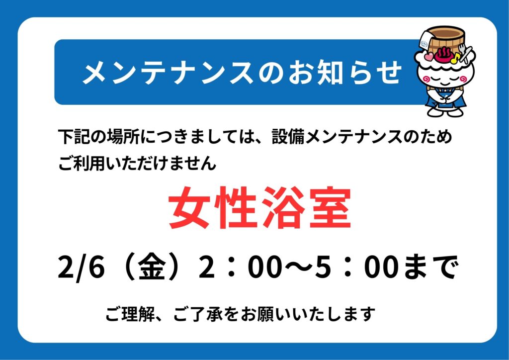 2月6日(金)女性浴室メンテナンスのお知らせ